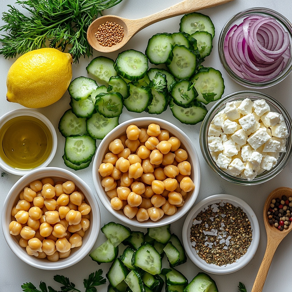 A refreshing and easy-to-make Chickpea Feta Salad combining protein-packed chickpeas with creamy feta, crisp cucumber, and a zesty herb dressing. Perfect as a light lunch or a flavorful side, this salad is tossed in a tangy blend of lemon, red wine vinegar, and spices, then chilled for optimal flavor.