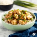 6. Serve: Spoon the thickened orange chicken over cooked brown or white rice. Garnish with chopped green onions for a fresh and vibrant finish. Serve immediately and enjoy!
