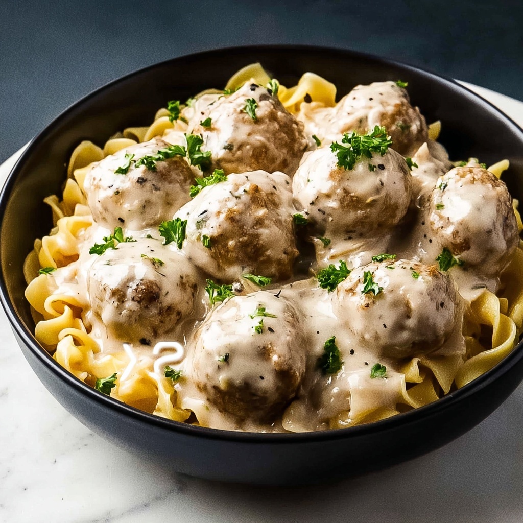 This Easy Swedish Meatballs recipe features tender, flavorful meatballs made from a blend of ground pork and beef, seasoned with warm spices and fresh parsley. The meatballs are pan-fried to a golden brown and then simmered in a rich, creamy sauce made from a classic roux, beef broth, Worcestershire sauce, and heavy cream. Ready in 45 minutes, these meatballs are perfect served over egg noodles or mashed potatoes for a comforting and satisfying meal.