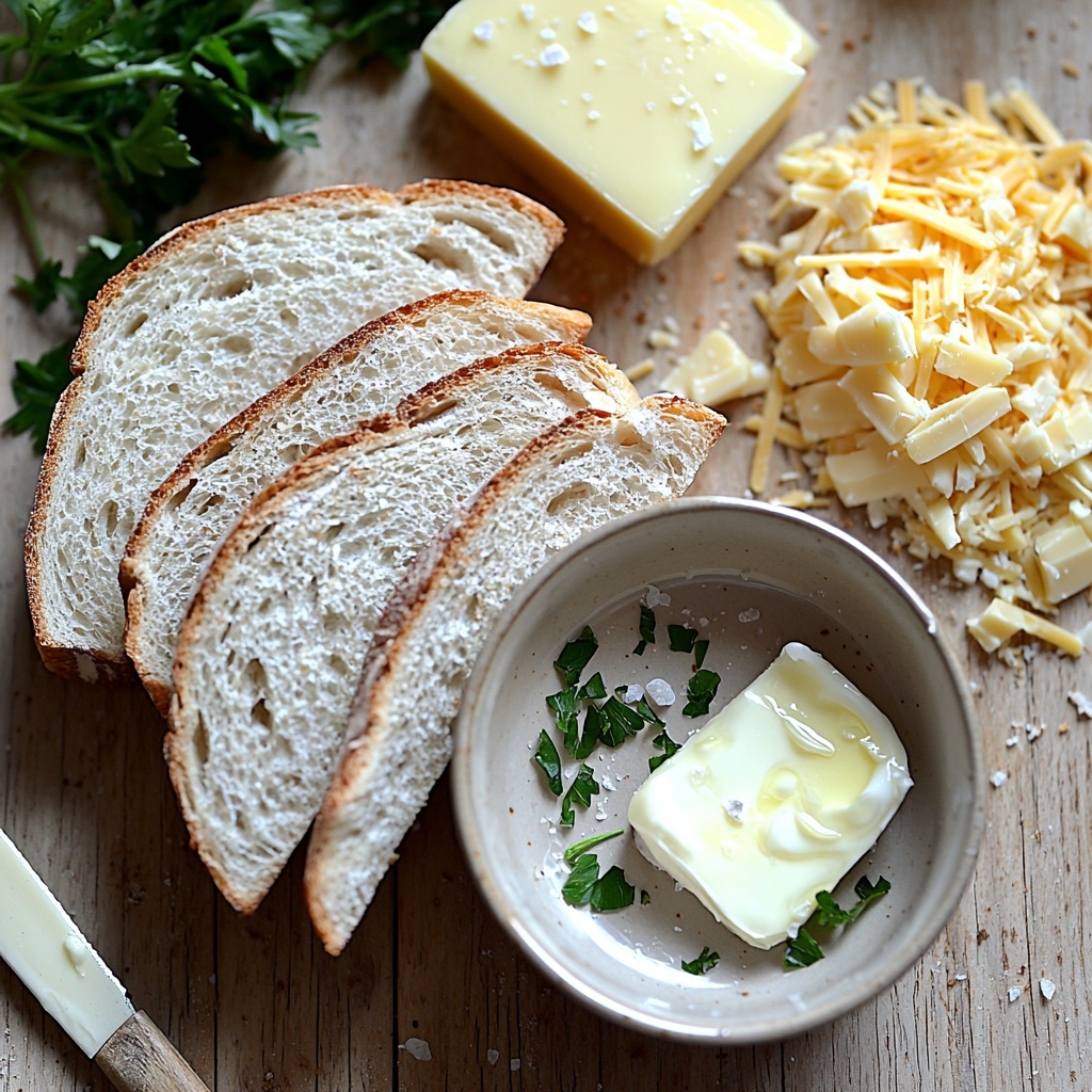 - 8 slices thick-cut Italian or sourdough bread: sturdy enough to hold the gooey cheese and stand up to the buttery garlic coating.