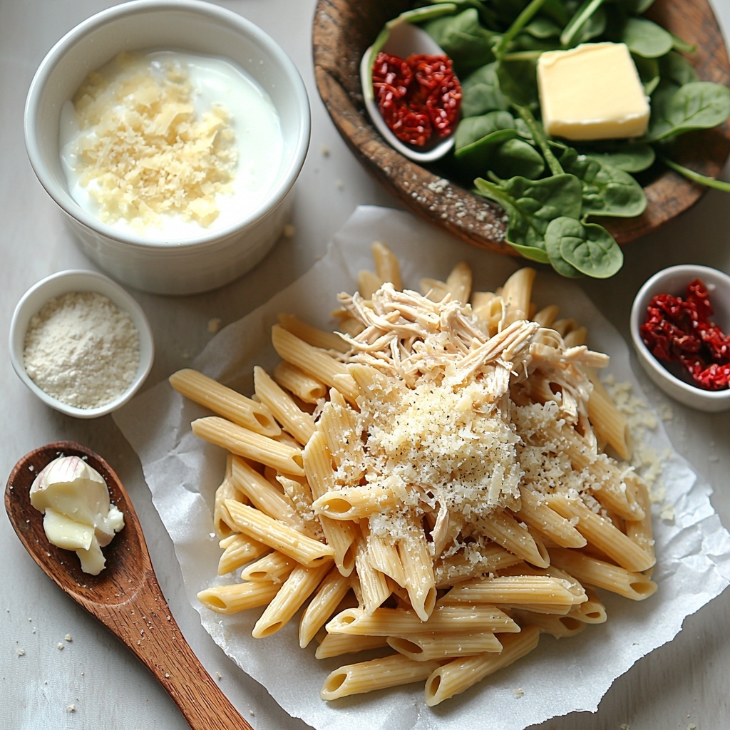 Every ingredient in this Greek Yogurt Chicken Alfredo Recipe plays a key role in creating a comforting creamy sauce, tender pasta, or vibrant pops of flavor. The list is simple and straightforward, which makes gathering everything stress-free and lets the fresh ingredients shine through.