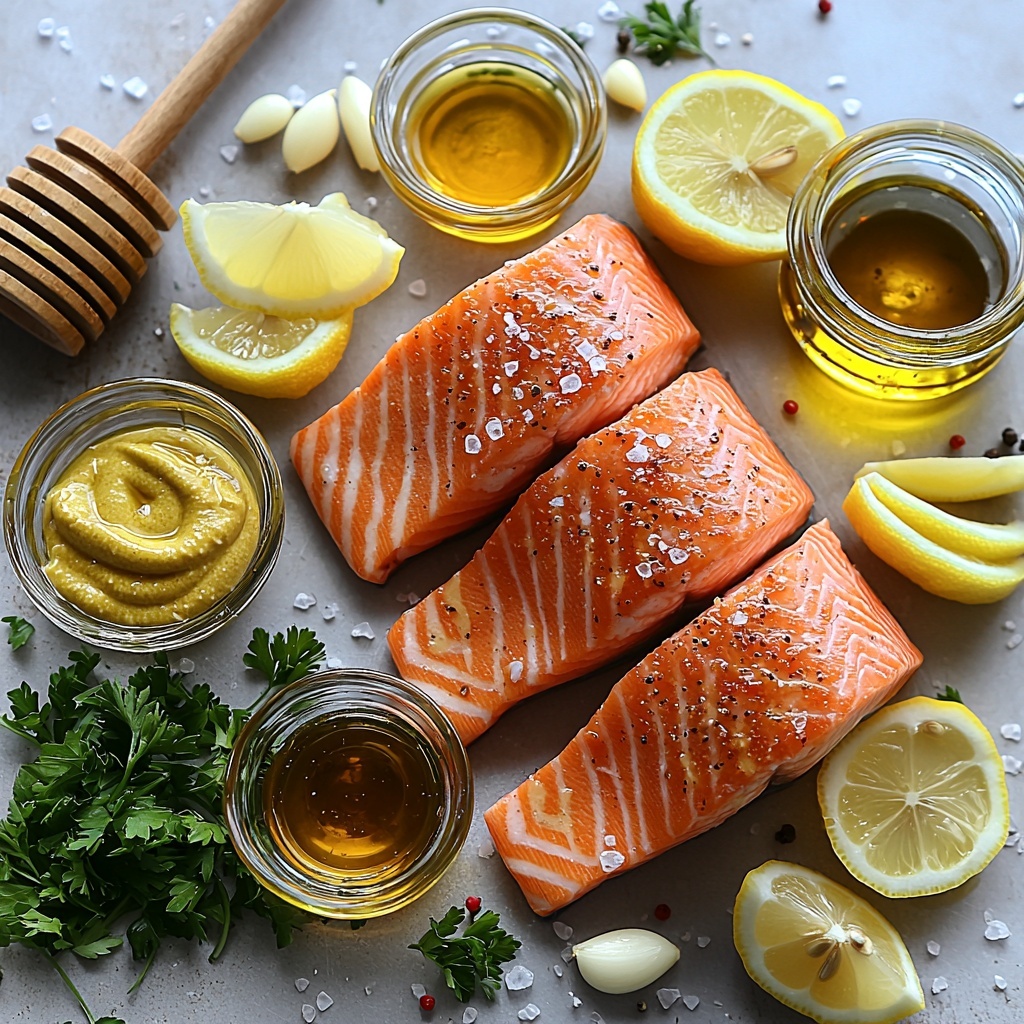In a small bowl, whisk together the Dijon mustard, whole grain mustard, honey, fresh lemon juice, minced garlic, olive oil, salt, and black pepper. This mixture is the heart of the Honey Mustard Baked Salmon Recipe, delivering that perfect marriage of bold, sweet, and tangy flavors. Whisk until silky and smooth—your salmon will thank you!