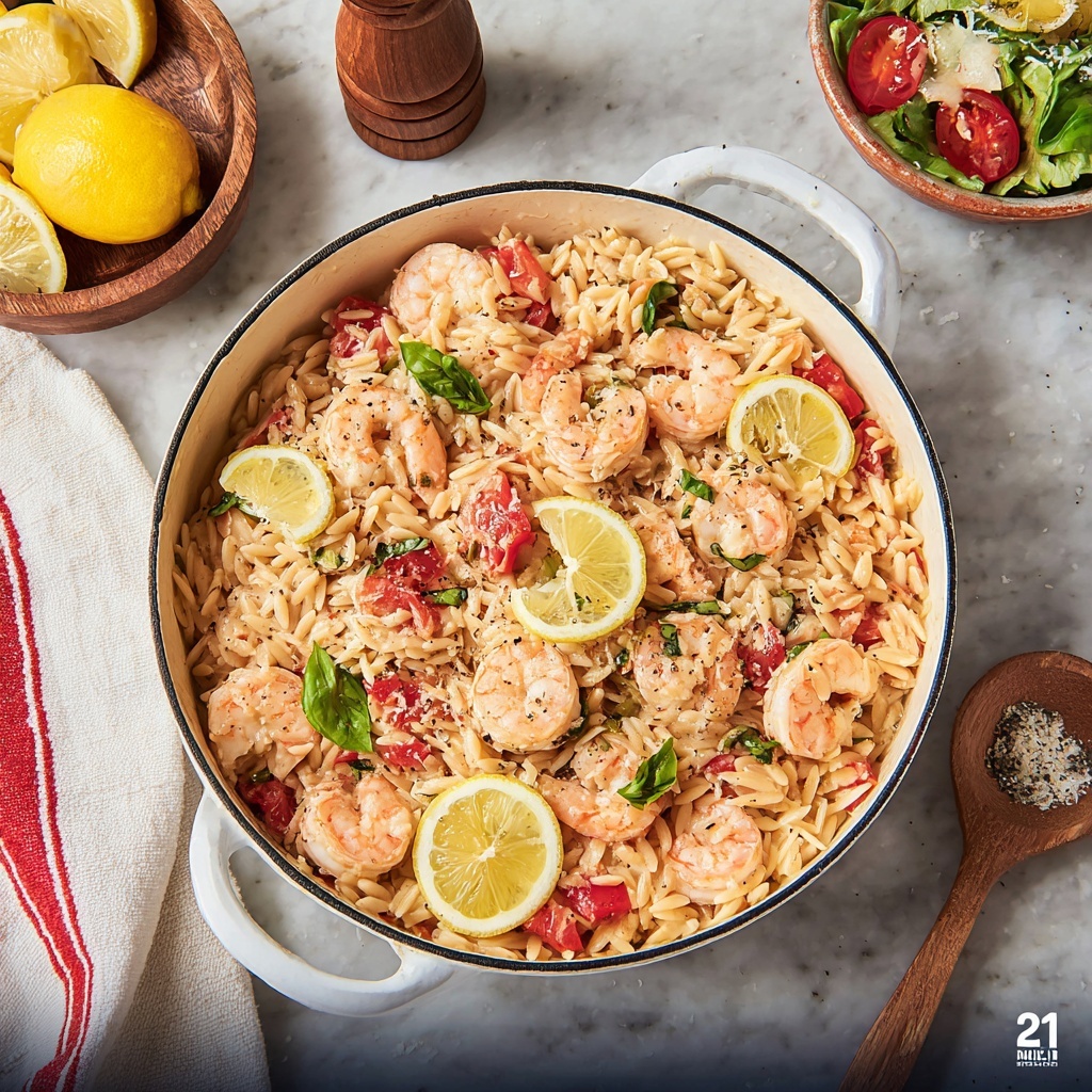 Once the orzo is tender, remove the pan from heat and stir in about one tablespoon of fresh lemon juice to add a burst of tanginess. Return the shrimp to the skillet, gently folding it in just to warm through without overcooking. This step lets the lemon shine without overpowering the shrimp’s delicate flavor.