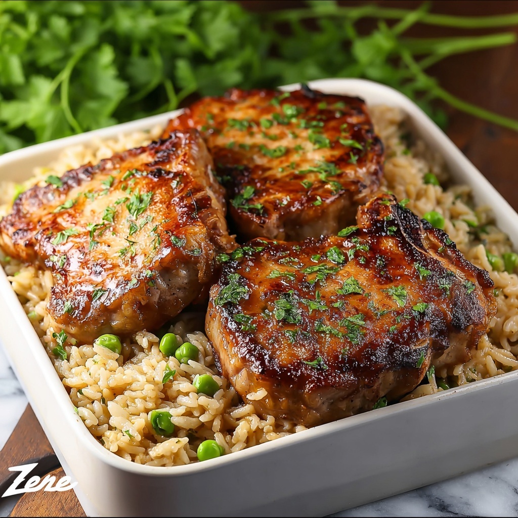 - Arrange the Pork Chops: Pat the pork chops dry with paper towels to promote even cooking. Place them evenly on top of the rice mixture in the baking dish.